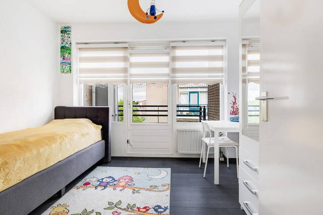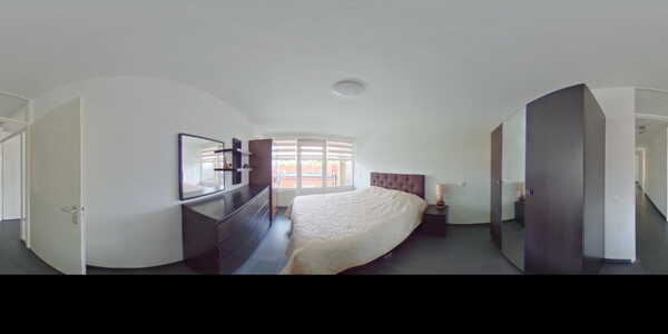 De ouderslaapkamer bevindt zich ook aan de voorzijde en biedt, net als de woonkamer, toegang tot het grote balkon.