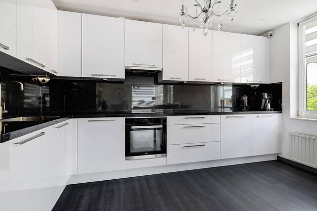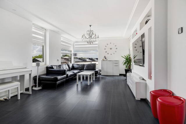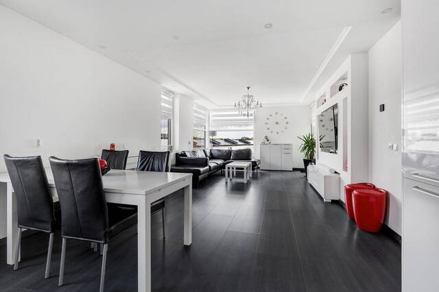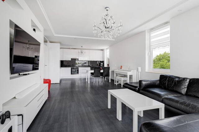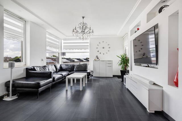 De royale woonkamer, gesitueerd aan de voorzijde, heeft toegang tot een groot balkon waar u in alle privacy kunt ontspannen. De ruimte is afgewerkt met gladde muren en een gestuukt plafond. De open keuken is modern en voorzien van alle gemakken, inclusief een royaal granieten werkblad. De keuken, uitgevoerd in wit met een zwart blad, biedt veel opbergruimte en is volledig uitgerust met apparatuur die onder garantie valt tot 2025 (installatiejaar 2020).