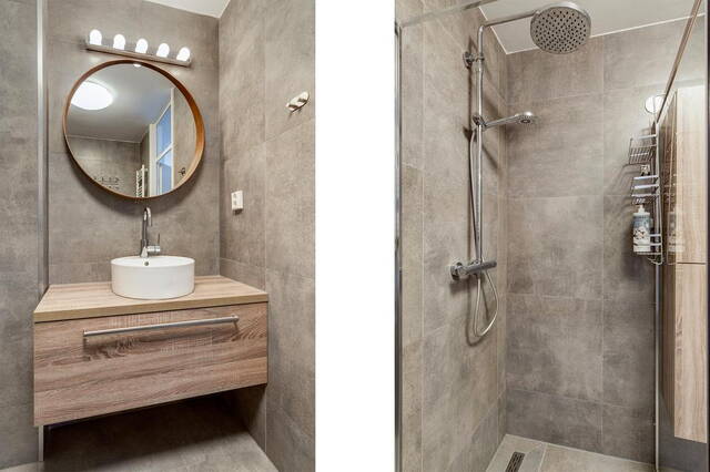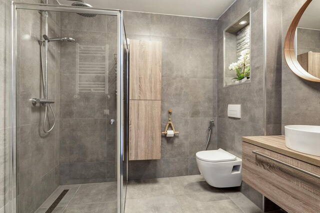 De badkamer, vernieuwd in 2020, is luxe en stijlvol afgewerkt. Deze beschikt over een inloopdouche, een wastafelmeubel en een tweede toilet. De neutrale kleuren en hoogwaardige materialen maken het tot een aangename ruimte.