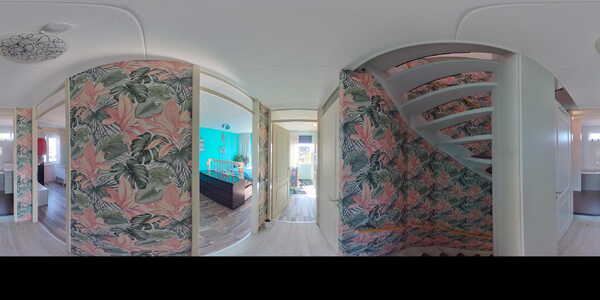 Op de bovenste verdieping komen we aan op de overloop, waar zich de heteluchtverwarming en de cv-ketel bevinden, samen met de aansluiting voor wasmachine en droger, de mechanische ventilatie en de omvormer van de 11 zonnepanelen. Daarnaast is er nog voldoende ruimte voor het wasrek.