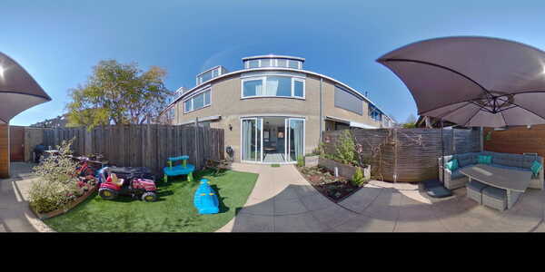 Via de schuifpui lopen we de tuin in, waar je de hele dag zon hebt — heerlijk! In de tuin staat een grote houten schuur voor de fietsen, het tuingereedschap en de kussens van de tuinmeubels. De tuin is leuk aangelegd met wat groen, ruimte voor plantjes en voldoende bestrating voor de tuinset. Met de buitenkraan geef je gemakkelijk je planten water en via de achterom zet je je fiets zo in de berging.