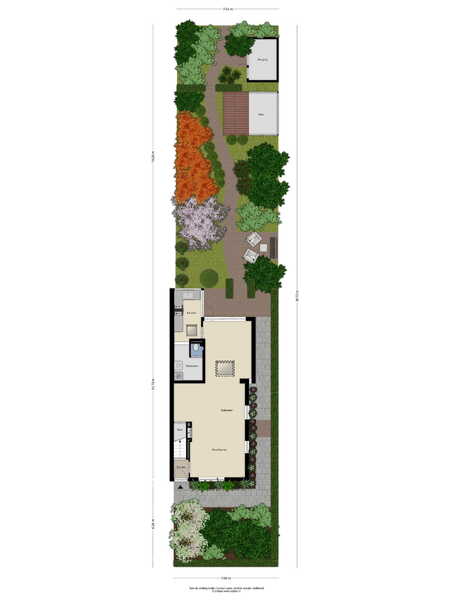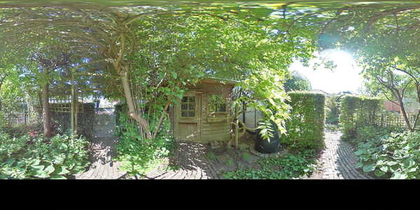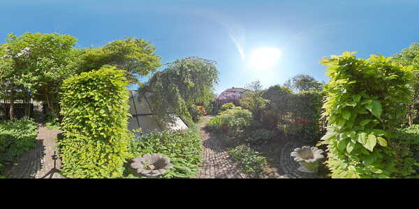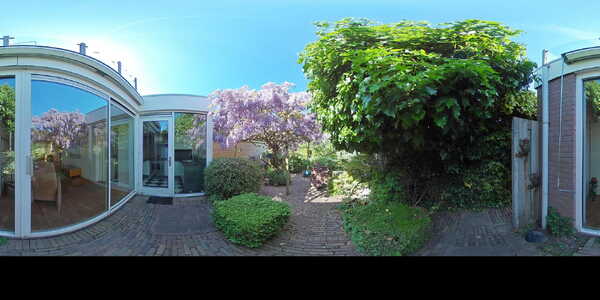 Vanuit de woonkamer aan de voorzijde heb je toegang tot de trapkast waar zich de meters bevinden en waar je bijvoorbeeld de stofzuiger kwijt kunt. De aangebouwde achterkamer is heel subtiel voorzien van een smal hoog raam waardoor je over het zijpad naar voren wegkijkt. Aan de achterzijde is een grote schuifpui geplaatst, zodat je zo de tuin inloopt. Laten we daar eerst maar eens doorheen gaan lopen, want de tuin is echt een oase van rust. De achtertuin is ruim 21 meter diep en 7,43 meter breed. Dat is een behoorlijk oppervlak en dat is dan ook verdeeld in een gezellig gedeelte waar je lekker zit te eten, een leuk borrelhoekje, een kas, berging en heel erg veel groen! Deze tuin is met veel gevoel en inzicht gecreëerd. Alleen de blauwe regen al is een lust voor het oog, je kijkt hier je ogen uit. Je kunt hier dan ook uren in aan de slag en als je nog geen groene vingers had, dan worden ze dat hier wel.
