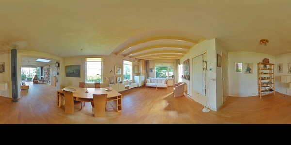 Via de voortuin stap je achter de voordeur de hal binnen en loopt gelijk door de woonkamer in. Dat is een enorme ruimte van 46 m2 met ramen aan de voor-, zij- en achterkant. Heerlijk, dat zorgt voor veel licht binnen. In de uitbouw aan de achterzijde is zelfs een lichtkoepel geplaatst voor optimaal licht.