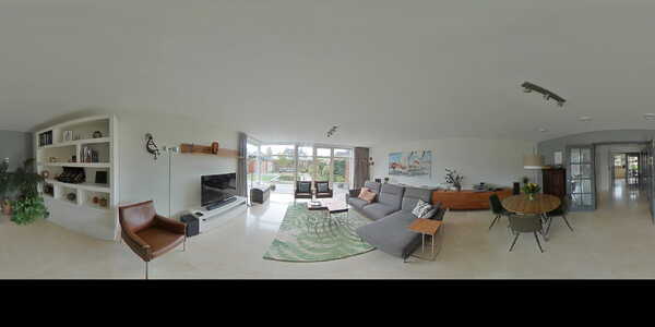 Woonkamer (ca. 45 m2) voorzien van een lichte marmervloer met vloerverwarming en glad gestucte wanden en plafond. De royale woonkamer is gelegen aan de achterzijde van de woning en beschikt over een groot raampartij en openslaande deuren met horren naar de tuin, waardoor u geniet van een zee aan daglicht en een naadloze verbinding tussen binnen en buiten. Verder is de woonkamer afgewerkt met elektrisch bedienbare screen.