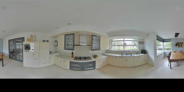 Woonkeuken (ca. 23 m2) voorzien van lichte marmervloer met vloerverwarming. Deze ruime woonkeuken vindt u aan de voorzijde van de woning, waar voldoende plaats is voor een grote eettafel. Ook hier valt de prettige lichtinval direct op, wat zorgt voor een open en aangename sfeer. Deze complete keuken is uitgevoerd in een U-opstelling en beschikt over diverse inbouwapparatuur zoals een koelkast, vrieskast, 5-pits gaskookplaat, RVS afzuigkap, combimagnetron, close-in boiler en een vaatwasser. Tevens beschikt de keuken over een dubbele spoelbak, een handige apotheekkast, extra stopcontacten voor uw keukenmachines en veel opslagruimte. Het geheel is afgewerkt met een granieten aanrechtblad en wanden, en sfeerverlichting. De raampartij in de keuken is voorzien van drie handmatig bedienbare markiezen.