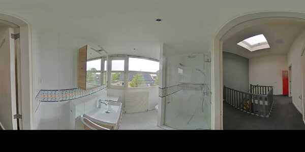 Moderne badkamer (ca. 9 m2) met sanitaire voorzieningen zoals een grote wastafel met twee kranen en wastafelmeubel, spiegel met spiegelmeubel en verlichting, hangend tweede toilet, ligbad, inloopdouche met regendouche en designradiator. De badkamer is geheel betegeld en afgewerkt met elektrische vloerverwarming, hor, spotjes en handmatig bedienbaar markies.