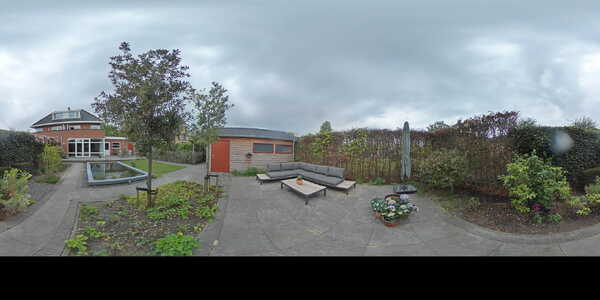 De voortuin is fraai aangelegd met sierbestrating en sierbeplanting. De voortuin is verder voorzien van een handige overkapping met spotjes, buitenkraan, verlichting met sensor en een ruime oprit met parkeergelegenheid voor 4 auto’s. Via de voortuin zijn de garage en de achtertuin bereikbaar.
