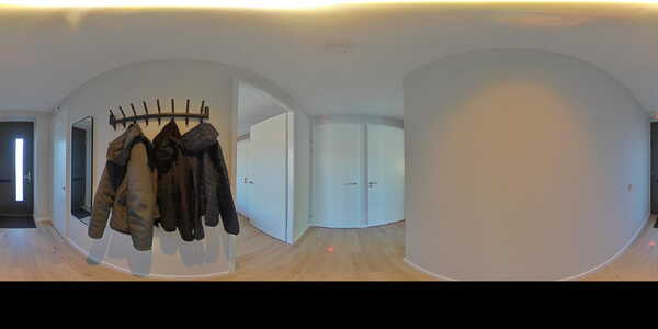 Wat heerlijk, je stapt door je eigen voortuin naar de voordeur waar je binnenkomt in de hal. In de grote brede hal treffen we direct de meterkast en is ruimte voor de jassen en eventueel een schoenenkast. Dan lopen we door de hoek om de woonkamer in. Wat een geweldige ruimte!
