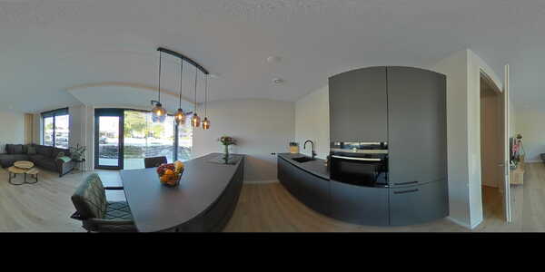 De woonkamer is ca. 26 m2 groot en heel erg goed ingedeeld. Door de grote raampartijen voelt de ruimte aanzienlijk groter. Aan de linkerzijde treffen we een gezellige zithoek waar je lekker neer kunt ploffen met een boek of even lekker wat TV kunt kijken. Aan de rechterzijde treffen we een prachtige luxe open keuken met bar. Stijlvol uitgevoerd in antraciet en voorzien van diverse inbouwapparatuur zoals de koelkast, vriezer, combi-oven, de vaatwasmachine en Bora kookplaat met geïntegreerde afzuiginstallatie. Het natuurstenen keukenblad en de Quooker maken de keuken helemaal af. Op het blad is voldoende plek voor je koffiemachine en bijvoorbeeld de keukenmachine of blender. In de laden en kastjes kun je al je keukenspullen kwijt en ook aan de kant van de woonkamer zijn onder het blad kastjes ingebouwd waar je nog diverse spulletjes kwijt kunt, dat scheelt weer een kast in de woonkamer.