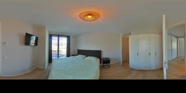 Terug in het appartement lopen we door de hal naar de slaapkamer waar je ruimte genoeg hebt voor een groot tweepersoonsbed en een kledingkast. De slaapkamer is voorzien van een kantel- kiepraam.