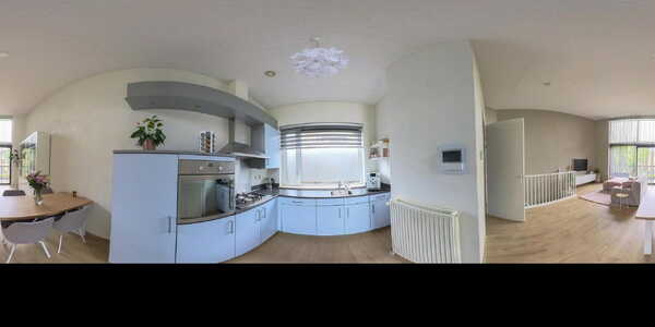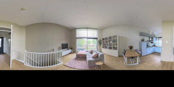 De woonkamer (ca. 30 m²) is opvallend licht en ruimtelijk door de hoge plafonds van ruim 4 meter en de grote raampartijen (voorzien van een elektrisch bedienbare screen) aan de achterzijde. Via een schuifpui bereikt u het balkon (gelegen op het zuiden), dat is voorzien van een zonnescherm (handbediend). De open keuken (ca. 5 m²) ligt aan de voorzijde van de woning en is uitgevoerd in een praktische hoekopstelling. Hier treft u diverse inbouwapparatuur aan zoals een oven, vaatwasser, koelkast met groot vriesvak, een 4-pits gaskookplaat en een RVS afzuigkap. De hele verdieping is afgewerkt met een sfeervolle laminaatvloer. Vanuit de woonkamer leidt een vaste trap naar de begane grond.