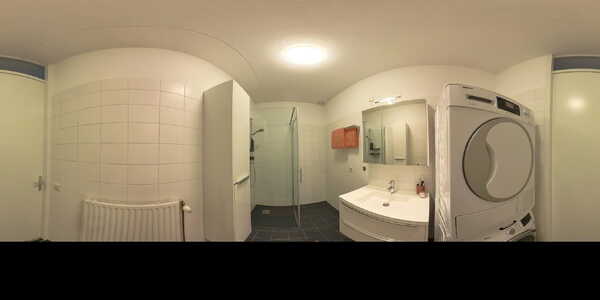 De badkamer (ca. 5 m²) is fris en modern afgewerkt in wit/grijstinten en beschikt over een inloopdouche, een wastafelmeubel met verlichte spiegel en aansluitingen voor wasmachine en droger. In de hal vindt u bovendien een handige vaste kast met ook weer een kast-in-kast oplossing. Vanuit de hal heeft u ook directe toegang tot de inpandige parkeergarage, waar uw eigen parkeerplaats zich bevindt, een bijzonder praktisch extraatje van deze woning.