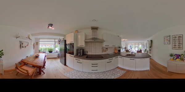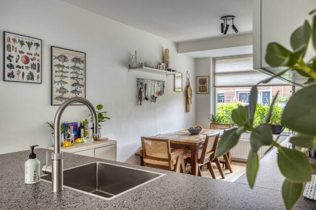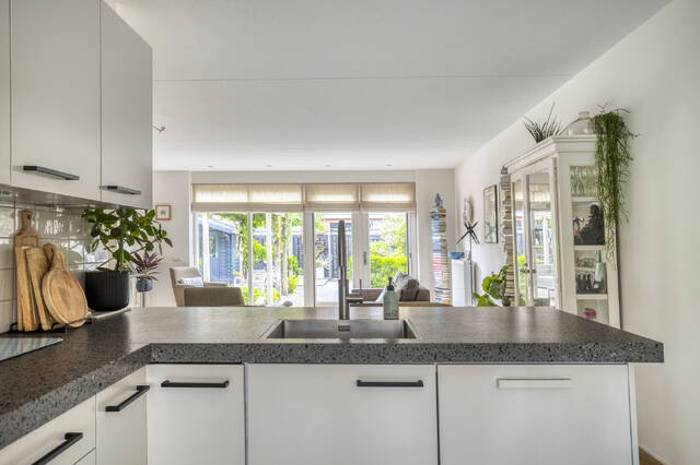 Aan de voorzijde bevindt zich de moderne keuken in hoekopstelling, uitgerust met hoogwaardige inbouwapparatuur (vernieuwd ca. 4 jaar geleden), waaronder een Quooker, inductiekookplaat, combi-oven en vaatwasser. Het karakteristieke erkerkozijn zorgt hier voor een mooie lichtinval en een extra gevoel van ruimte en sfeer. Het composiet aanrechtblad en de lichte kleurstelling geven de keuken een frisse, tijdloze uitstraling.