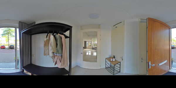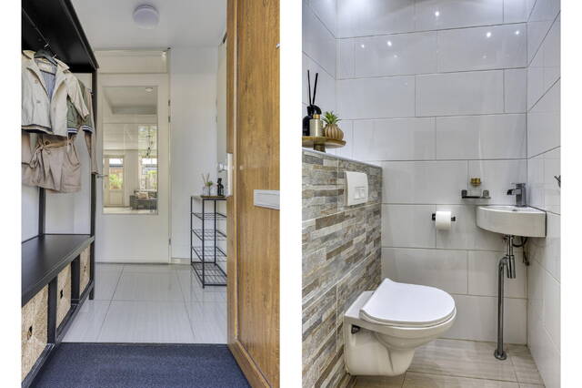 Entree, hal met meterkast, toiletruimte voorzien van een hangend toilet en een hoekfonteintje. De toiletruimte is geheel betegeld in een wit/beige kleurstelling en is afgewerkt met spotjes. Via een glazen deur heeft u toegang tot de woonkamer.