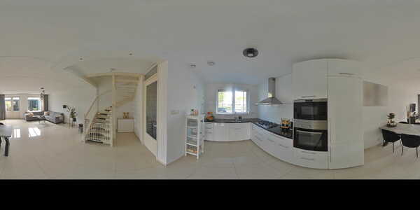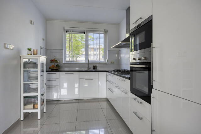 De moderne open keuken (ca. 7 m2) is gelegen aan de voorzijde van de woning en is uitgevoerd in een L-opstelling. Deze complete keuken is voorzien van diverse apparatuur zoals een koelkast, vrieskast, 5-pits gaskookplaat, RVS afzuigkap, oven, magnetron en een vaatwasser. Tevens beschikt de keuken over een enkele spoelbak en voldoende kastruimte. Het geheel is uitgevoerd in hoogglans wit en afgewerkt met een composiet aanrechtblad en 60x60 tegelvloer met vloerverwarming. De voorgevel van de keuken is afgewerkt met een handmatig bedienbaar rolluik.