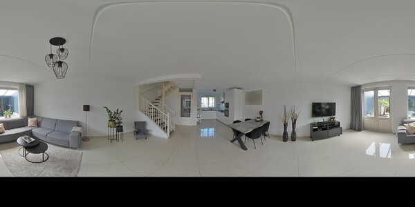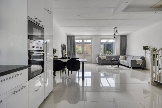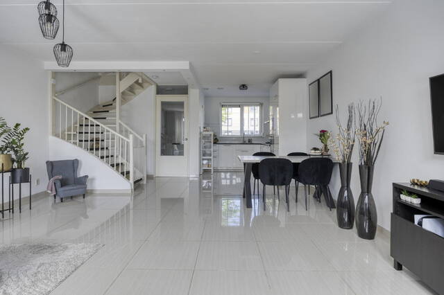 Lichte tuingerichte woonkamer (ca. 40 m2) voorzien van een lichte 60x60 tegelvloer met vloerverwarming en glad gestucte wanden. Trap naar de 1e verdieping. Middels openslaande deuren met hor heeft u toegang tot de zonnige achtertuin. De achtergevel van de begane grond is voorzien van elektrisch bedienbaar rolluik.