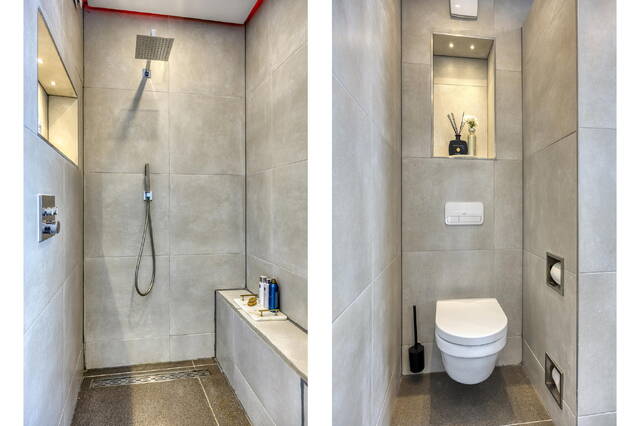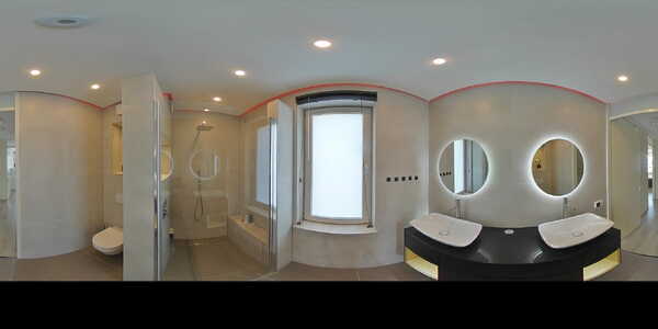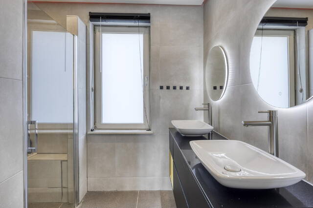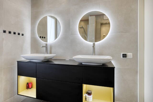 Moderne badkamer (ca. 6 m2) met luxe sanitaire voorzieningen zoals twee Villeroy en Boch wastafels met wastafelmeubel met ingebouwde verlichting, twee spiegels met ingebouwde verwarming en verlichting, hangend Villeroy en Boch tweede toilet en inloopdouche met een regendouche, inbouwwaterkranen en twee nisjes met sfeerverlichting. De badkamer is geheel betegeld in een lichte beige kleurstelling en is afgewerkt met sfeerverlichting met sensor, tegelvloer met vloerverwarming, en een handmatig bedienbaar rolluik.