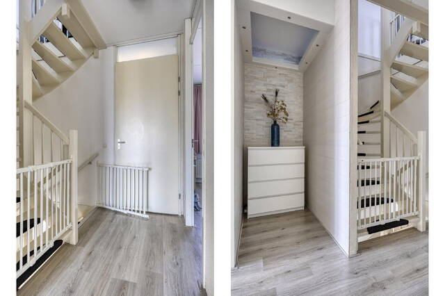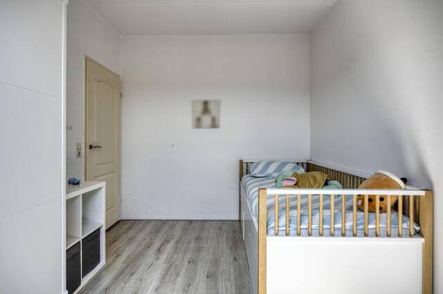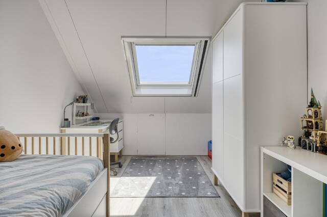 De slaapkamers op deze verdieping zijn verder afgewerkt met een duurzame laminaatvloer en glad gestucte wanden.