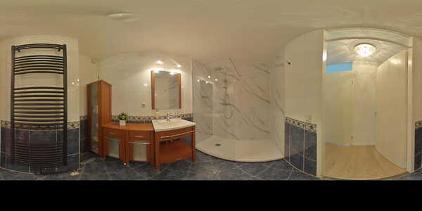 Moderne badkamer (ca. 6 m2) met luxe sanitaire voorzieningen zoals een wastafel met wandmeubel, spiegel, verlichting, designradiator en inloopdouche met regendouche. De badkamer is geheel betegeld in een lichte kleurstelling.