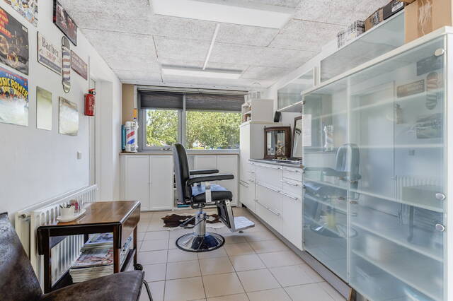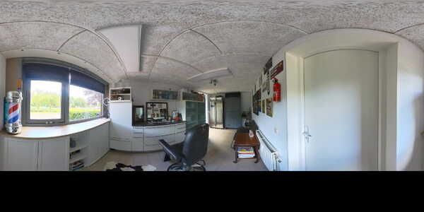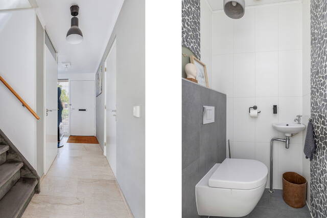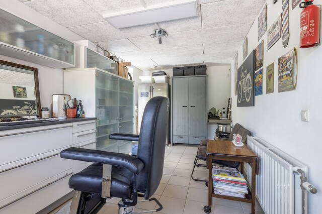Via de entree komt u in de hal met meterkast en modern toilet (zwevend, volledig betegeld, met fonteintje). Vanuit de hal is er toegang tot de voormalige garage, die is omgebouwd tot salon. Deze ruimte is voorzien van een plavuizenvloer, verwarming en een nieuwe pui (2023). Dankzij de deur in de zijtuin, eigen entree, is dit een veelzijdige ruimte, geschikt als praktijk, werkruimte of hobbykamer.