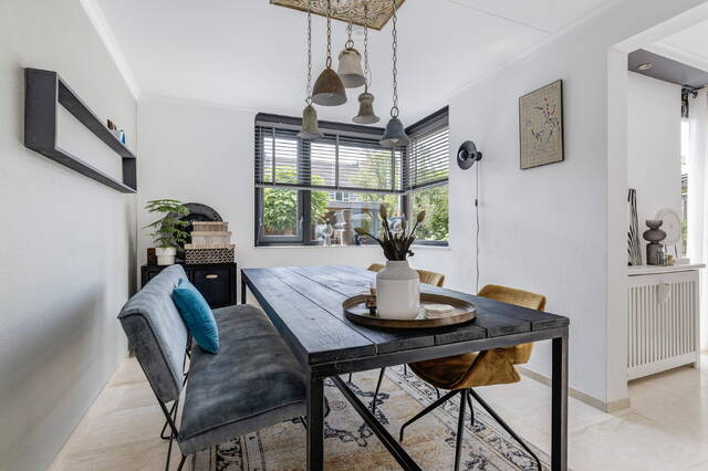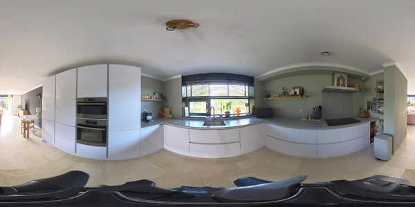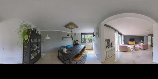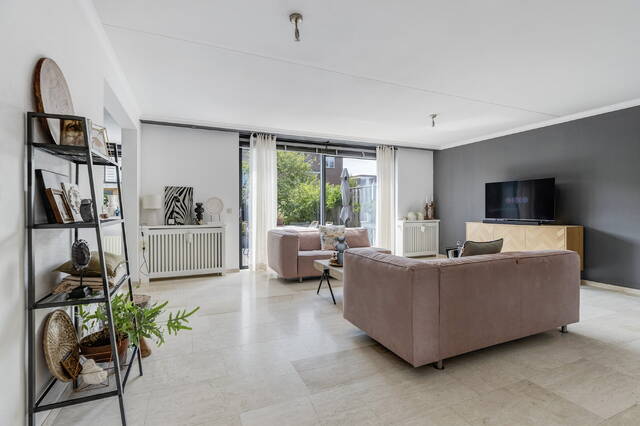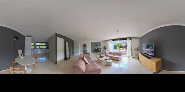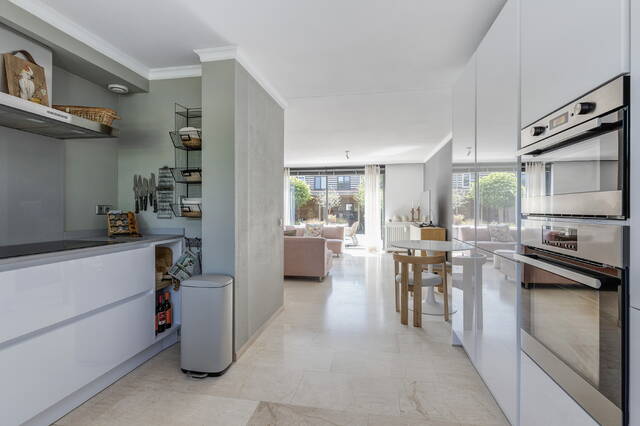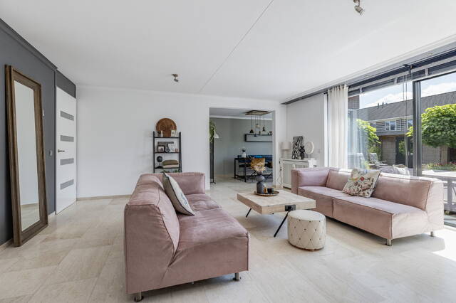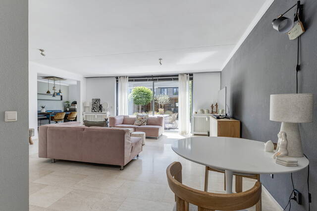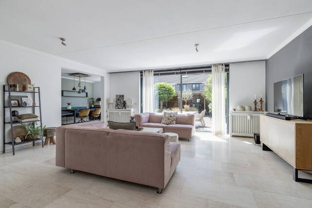 De zeer royale woonkamer is tuingericht en heerlijk licht dankzij de schuifpui naar de achtertuin en de tuinkamer aan de achterzijde. De speelse indeling en het natuurlijke licht zorgen voor een fijne leefruimte. De begane grond vloer is grotendeels voorzien van marmer gecombineerd met comfortabele vloerverwarming.