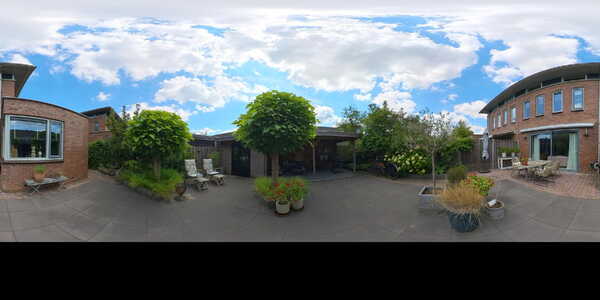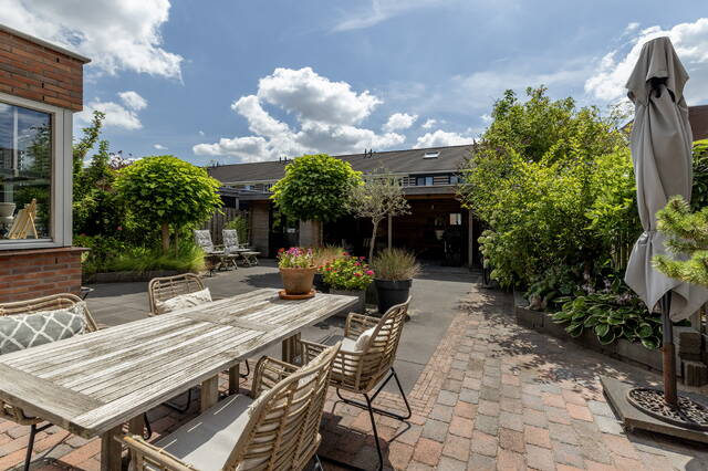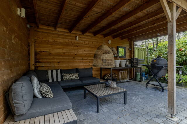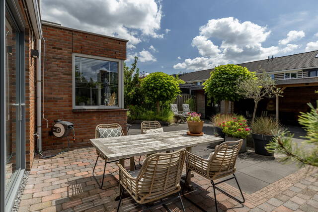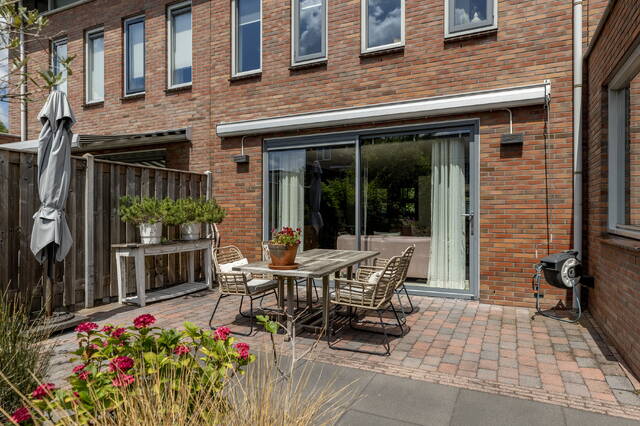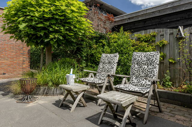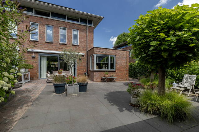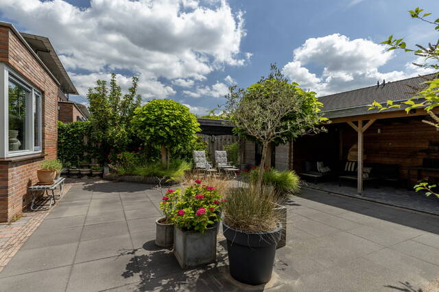 De brede, diepe achtertuin is fraai aangelegd en beschikt over een overkapping met bergruimte, uitgang, buitenkraan en een zonnescherm. De ligging zorgt voor veel zon en privacy – een heerlijke plek om buiten te genieten.