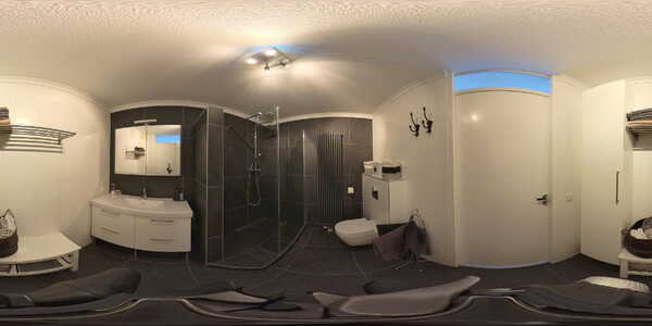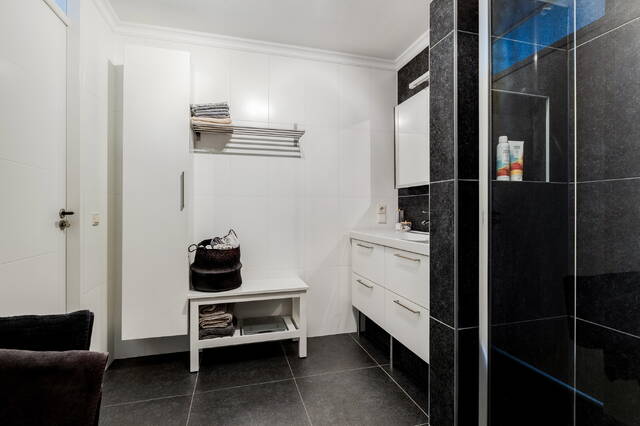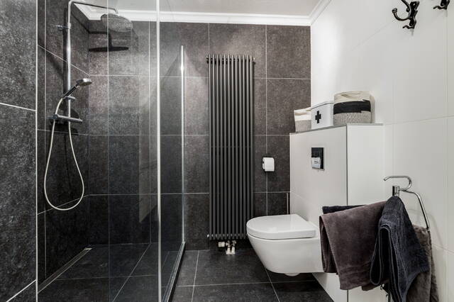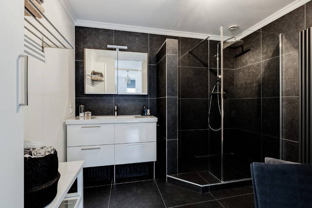 De badkamer is netjes afgewerkt met witte en antracietkleurige betegeling en beschikt over een ruime inloopdouche met stortdouche, een wastafelmeubel met spiegelkast en een designradiator.