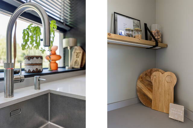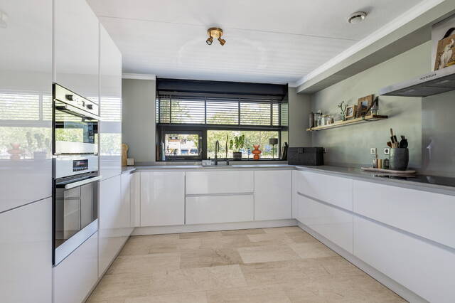 Aan de voorzijde van de woning bevindt zich de riante keuken in U-opstelling. Deze keuken biedt volop werk- en bergruimte en is voorzien van alle benodigde inbouwapparatuur: een inductiekookplaat, Quooker, vaatwasser, koelkast, combi- en een heteluchtoven, afzuigschouw en Le Mans-hoekkast. Het witte keukenmeubilair en het taupekleurige composieten werkblad vormen samen een stijlvol geheel. Bovendien kijkt u vanuit de keuken vrij uit over de singel.