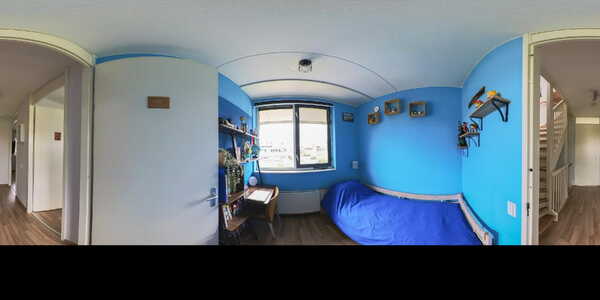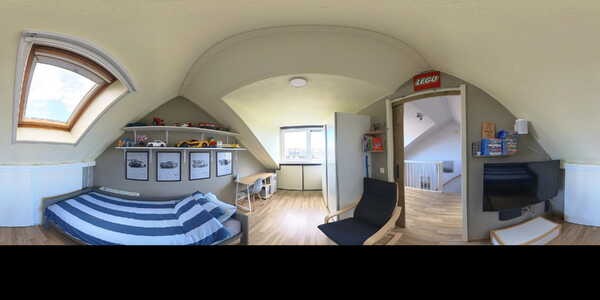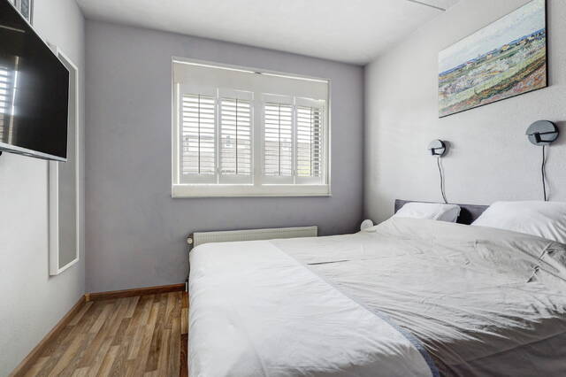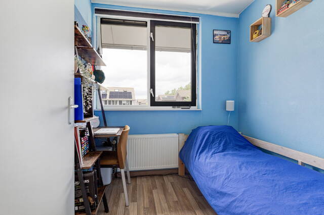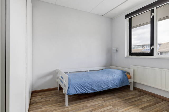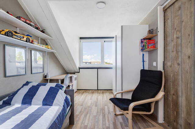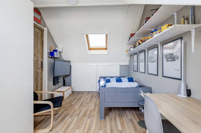 De slaapkamer (ca. 11 m²) op deze verdieping bereikt men via een stoere houten schuifdeur en is voorzien van een Velux dakraam en dakkapel, waardoor de ruimte licht en functioneel is. Bergruimte achter de knieschotten maakt optimaal gebruik van de aanwezige ruimte.