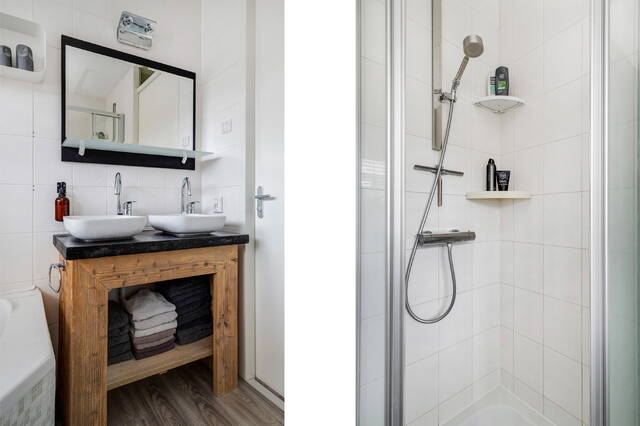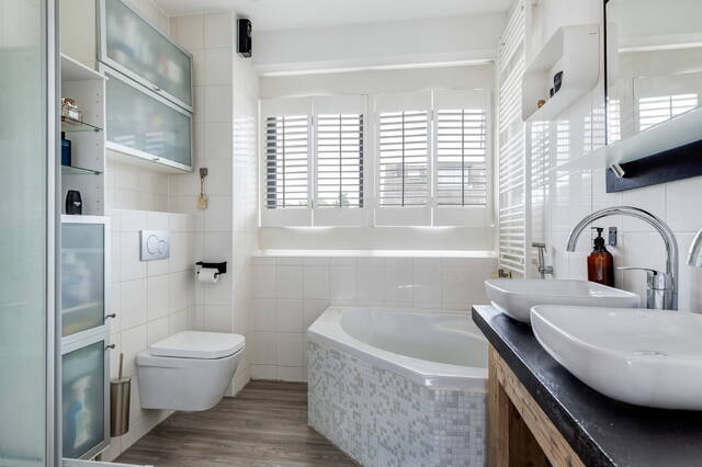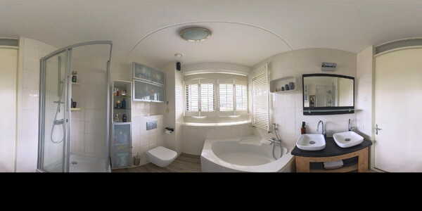 De complete badkamer (ca. 5 m²) beschikt over een hoekligbad, separate douchecabine, een tweede hangend toilet en een wastafelmeubel met twee waskommen, voor een comfortabele ochtendroutine.