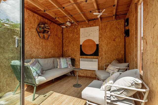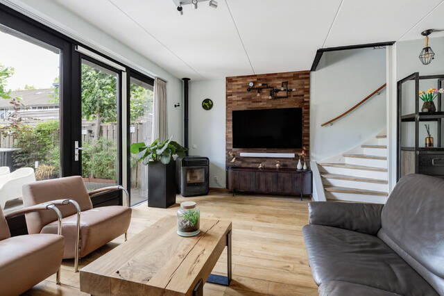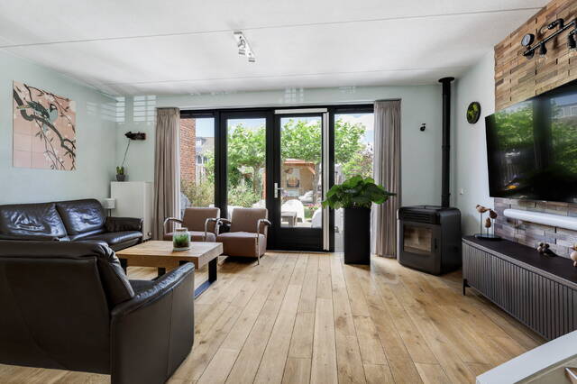 Via de paneeldeur wandel je de woonkamer (ca. 33 m²) in, die een warme sfeer uitstraalt dankzij de eikenhouten vloer en de palletkachel.