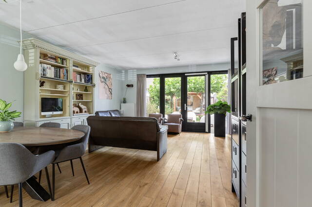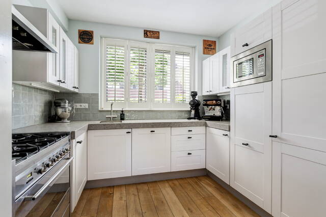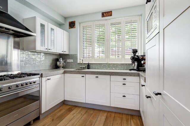 Aan de voorzijde bevindt zich de moderne, U-vormige keuken (ca. 7 m²) met diverse inbouwapparatuur waaronder een 5-pits gasfornuis, oven, magnetron, RVS afzuigkap, vaatwasser, koelkast en een kokend waterkraan. Vanuit de keuken en woonkamer geniet je via grote ramen en openslaande deuren van uitzicht op de gezellige tuin.