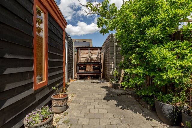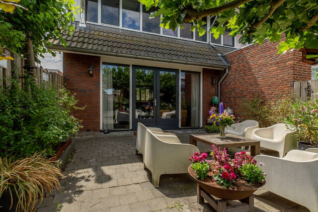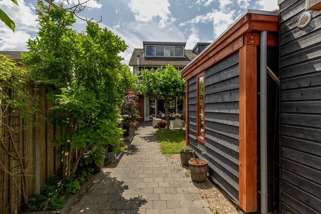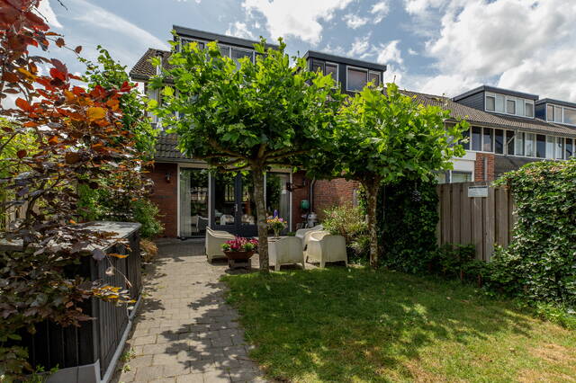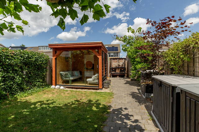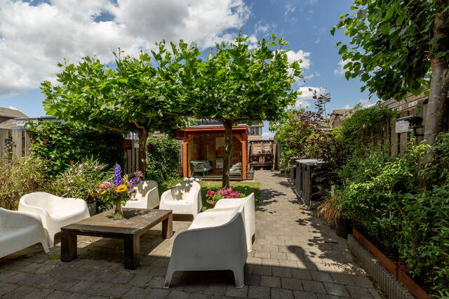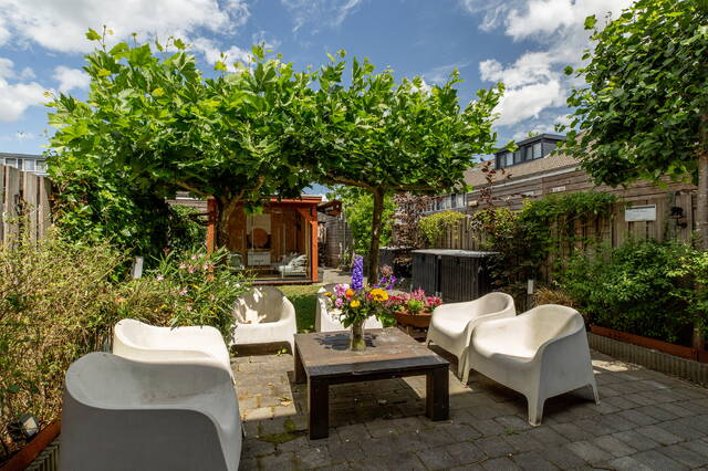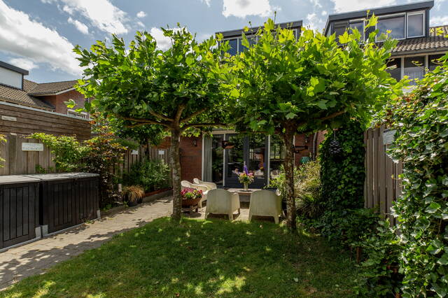 De tuin is ruim en sfeervol, ongeveer 16 meter diep, met sierbeplanting, gras en mooie bomen zoals dakplatanen en leilinden. De overkapping, afsluitbaar met een glazen schuifwand, biedt een gezellige plek om het hele jaar door buiten te genieten. De tuin is ook bereikbaar via een poort aan de zijkant.