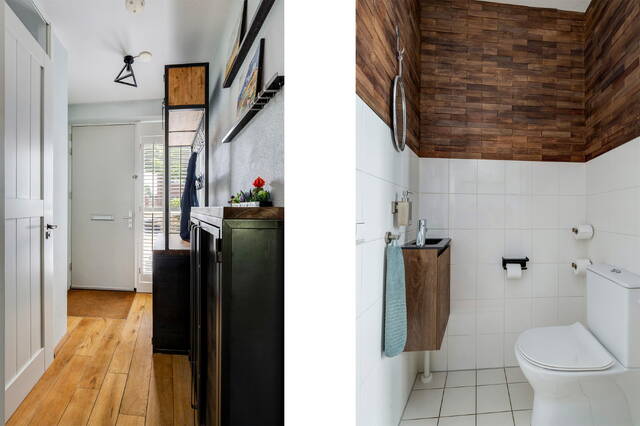 Bij binnenkomst in de hal vind je de meterkast en een praktische toiletruimte, afgewerkt in een lichte kleur met duoblok toilet en handig kastje met fontein.