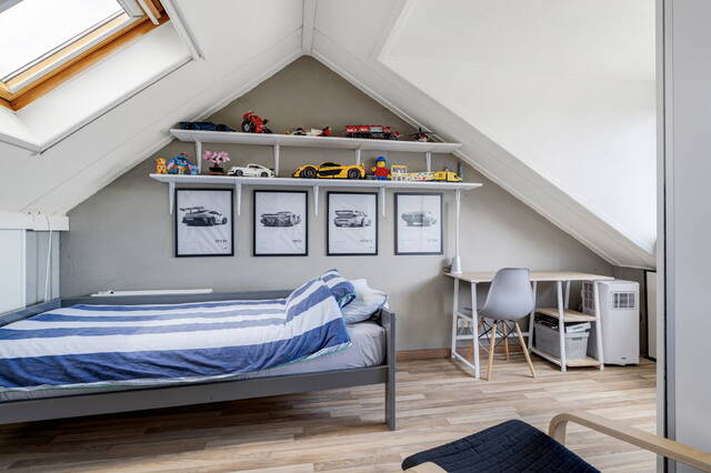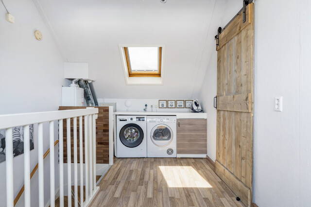De ruime zolder heeft een praktische overloop met aansluiting voor de wasmachine en droger, en de CV-ketel. Met Velux dakramen voor extra licht en een zolderdakkapel aan de achterzijde is deze verdieping goed te gebruiken als slaapkamer of kantoorruimte.
