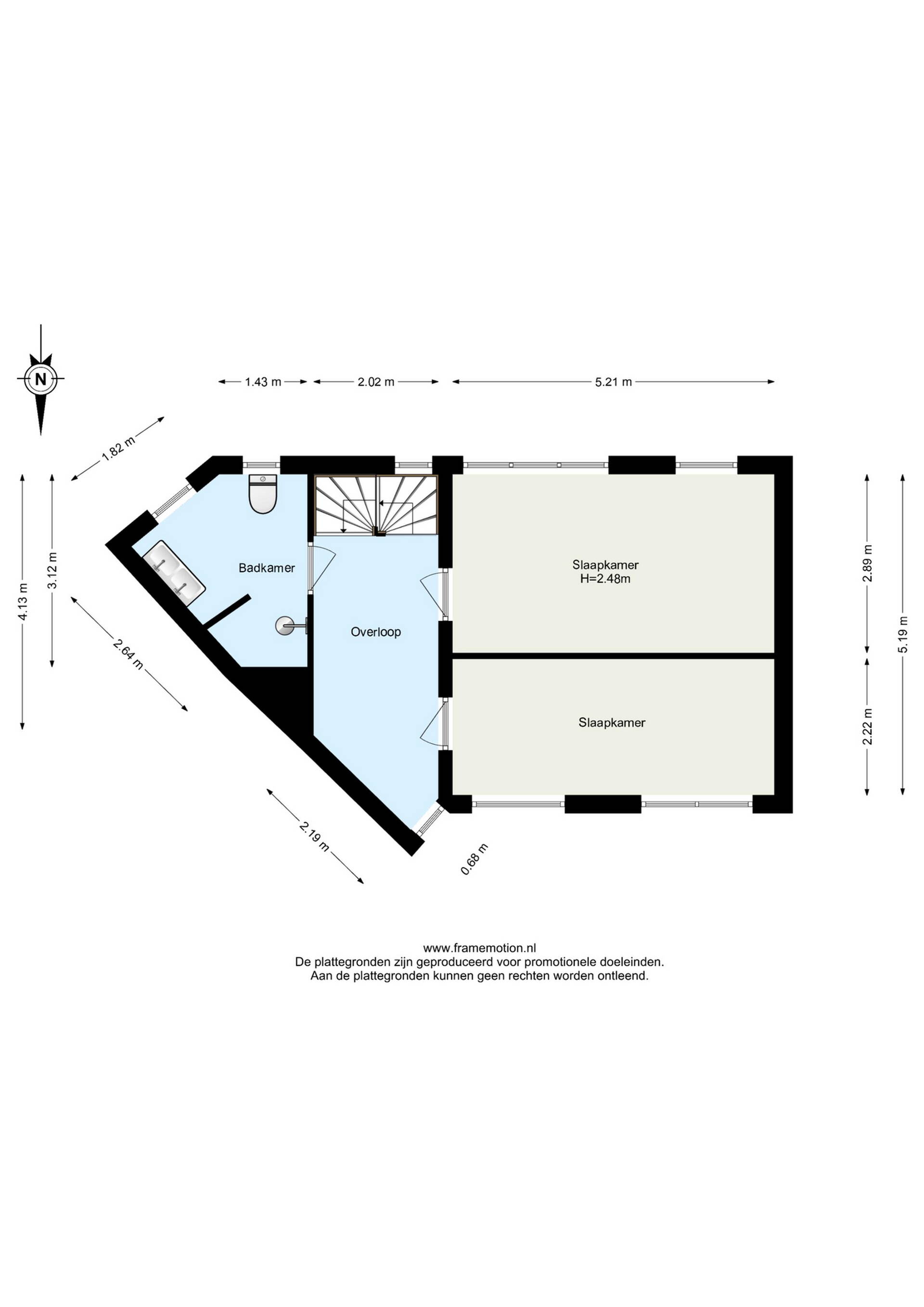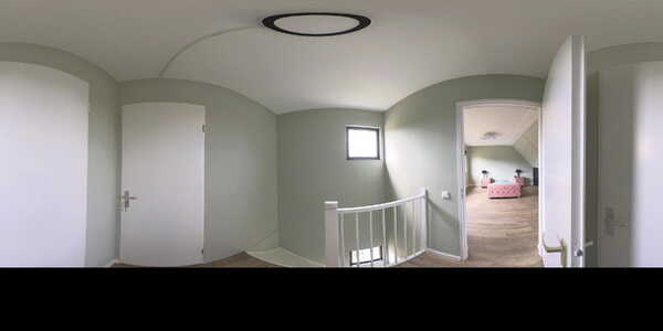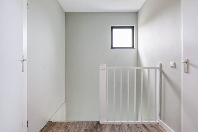 De overloop biedt toegang tot twee slaapkamers en de badkamer.