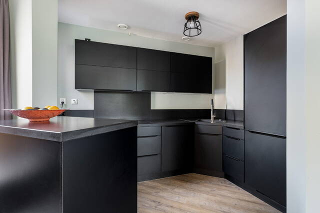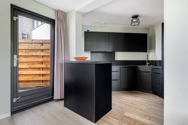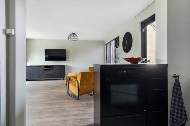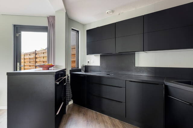 De open keuken (ca. 5 m²) is in 2020 vernieuwd en uitgevoerd in stijlvol zwart met een granieten werkblad. De keuken in hoekopstelling is voorzien van hoogwaardige inbouwapparatuur, waaronder een Bora-inductiekookplaat, combi-oven met stoomfunctie, vaatwasser en koelkast. De begane grond is strak afgewerkt met glad stucwerk en een pvc-vloer.