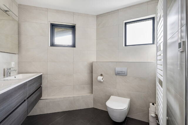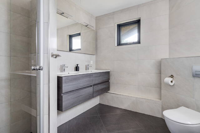 De luxe badkamer (ca. 5 m²) is volledig betegeld in neutrale tinten en uitgerust met een ruime inloopdouche, een tweede hangend toilet, een dubbel wastafelmeubel en spiegel met verlichting. Extra comfort wordt geboden door vloerverwarming.