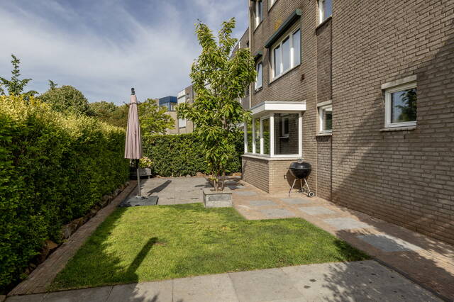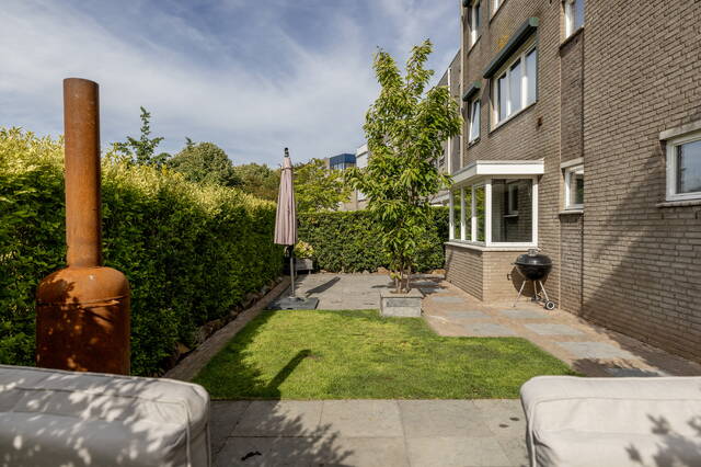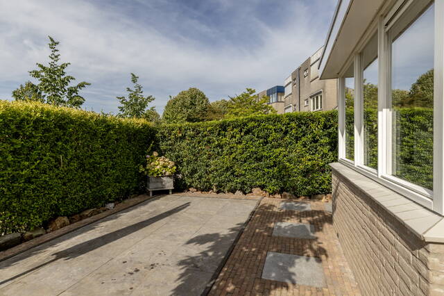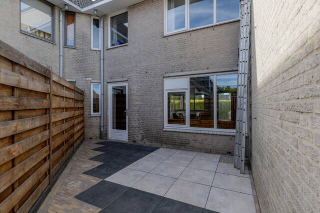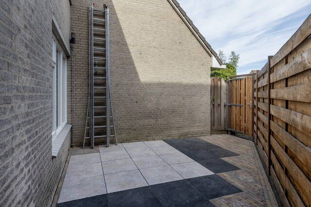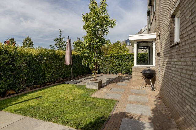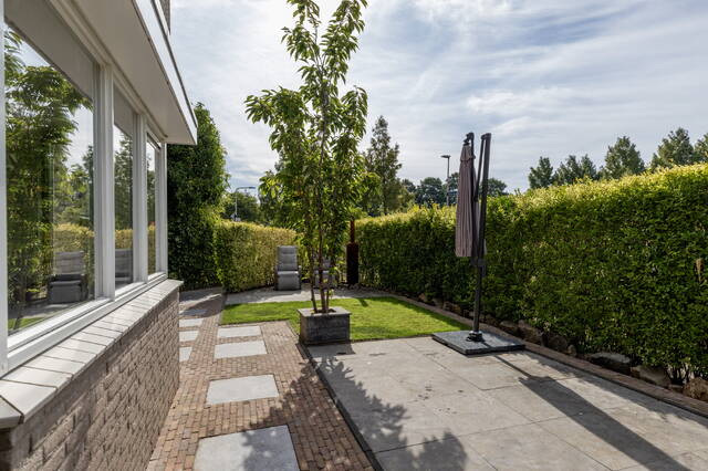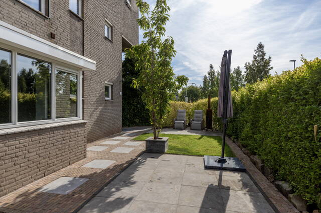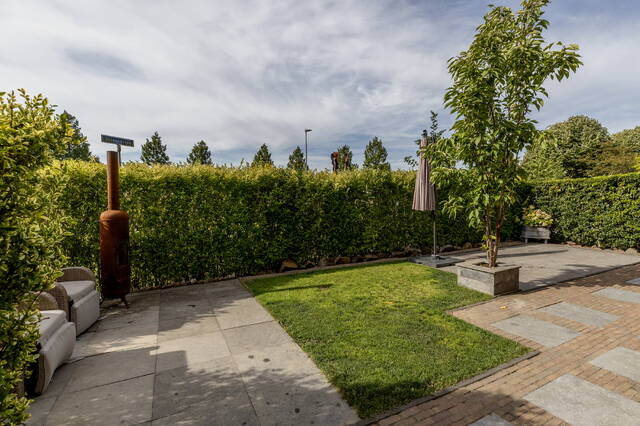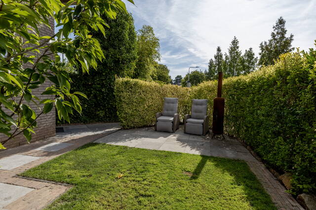De achtertuin is volledig bestraat en voorzien van houten erfafscheidingen. Aan de voorzijde ligt de royale, sfeervol aangelegde tuin op het zuiden, omheind met een groene haag en ingericht met gras en sierbestrating, ideaal voor meerdere zitjes en optimaal genieten van de zon en privacy.
