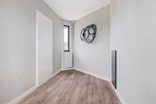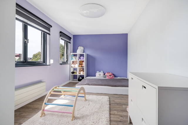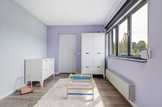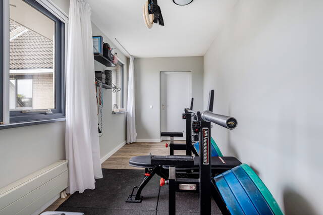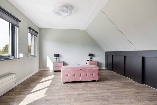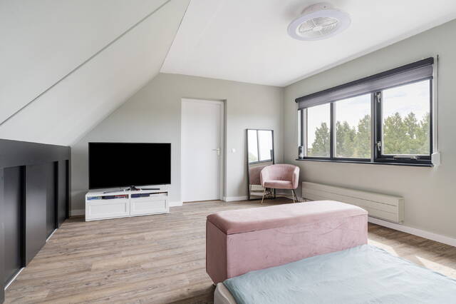 Hier vindt u een overloop met een afgesloten wasruimte, voorzien van wasmachine/droger aansluiting en de cv-opstelling. Daarnaast is er een ruime derde slaapkamer (ca. 21 m²) met groot raam aan de voorzijde, bergruimte achter de knieschotten en een duurzame PVC-vloer.