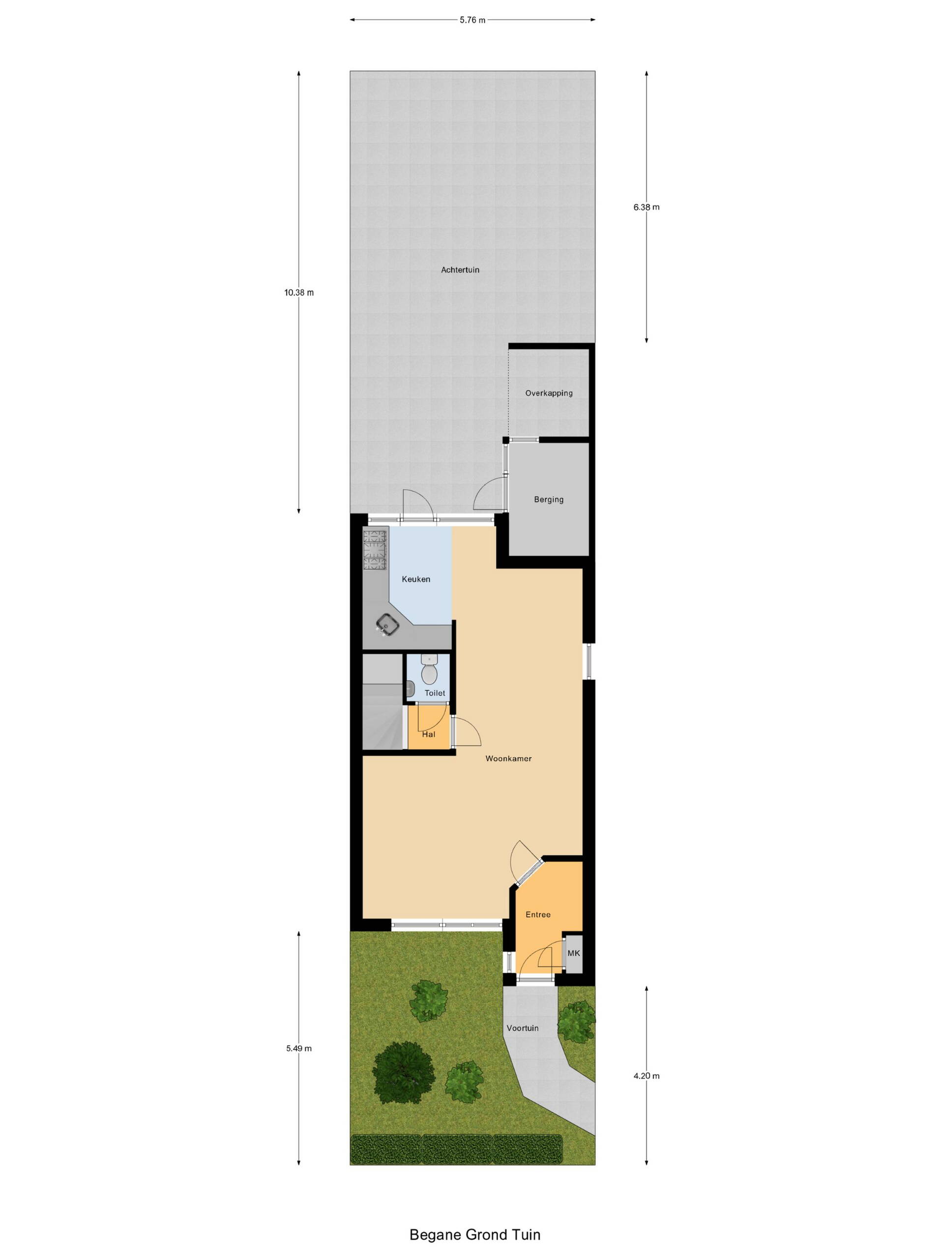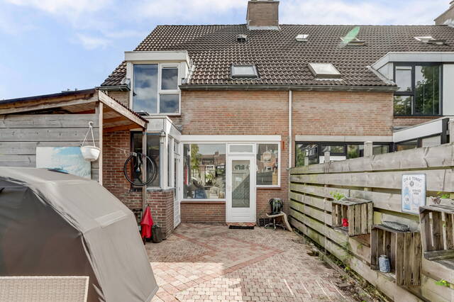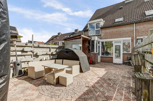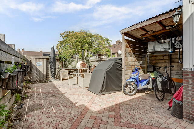 Vanuit de keuken stap je zo de achtertuin van ca. 58 m² in. De tuin is netjes bestraat en makkelijk in te delen met een zithoek en een plek voor de BBQ. Onder de overkapping kun je de fietsen kwijt, die via de achterom de tuin in kunnen. Vanuit de tuin heb je ook toegang tot de berging van ca. 4 m².