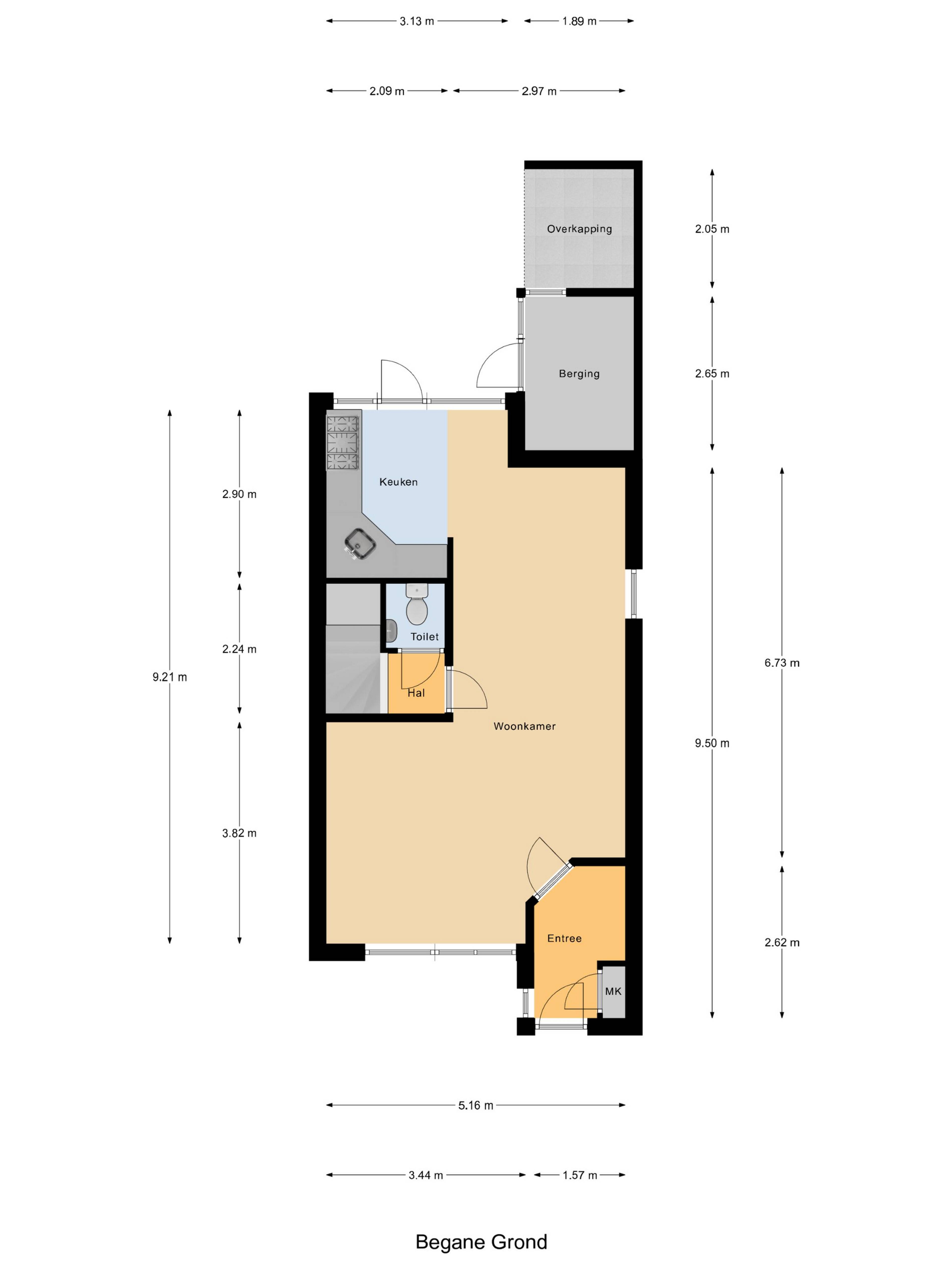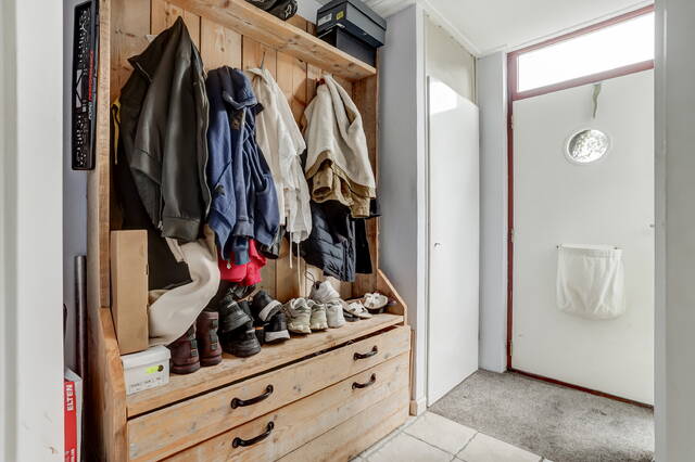 Je parkeert de auto in een van de parkeerhavens en loopt langs het gemeentegroen door je eigen voortuin naar de voordeur. Binnenkomend in de hal hang je je jas op aan de kapstok en plaats je je schoenen in het schoenenrek. Hier vind je ook de meterkast.