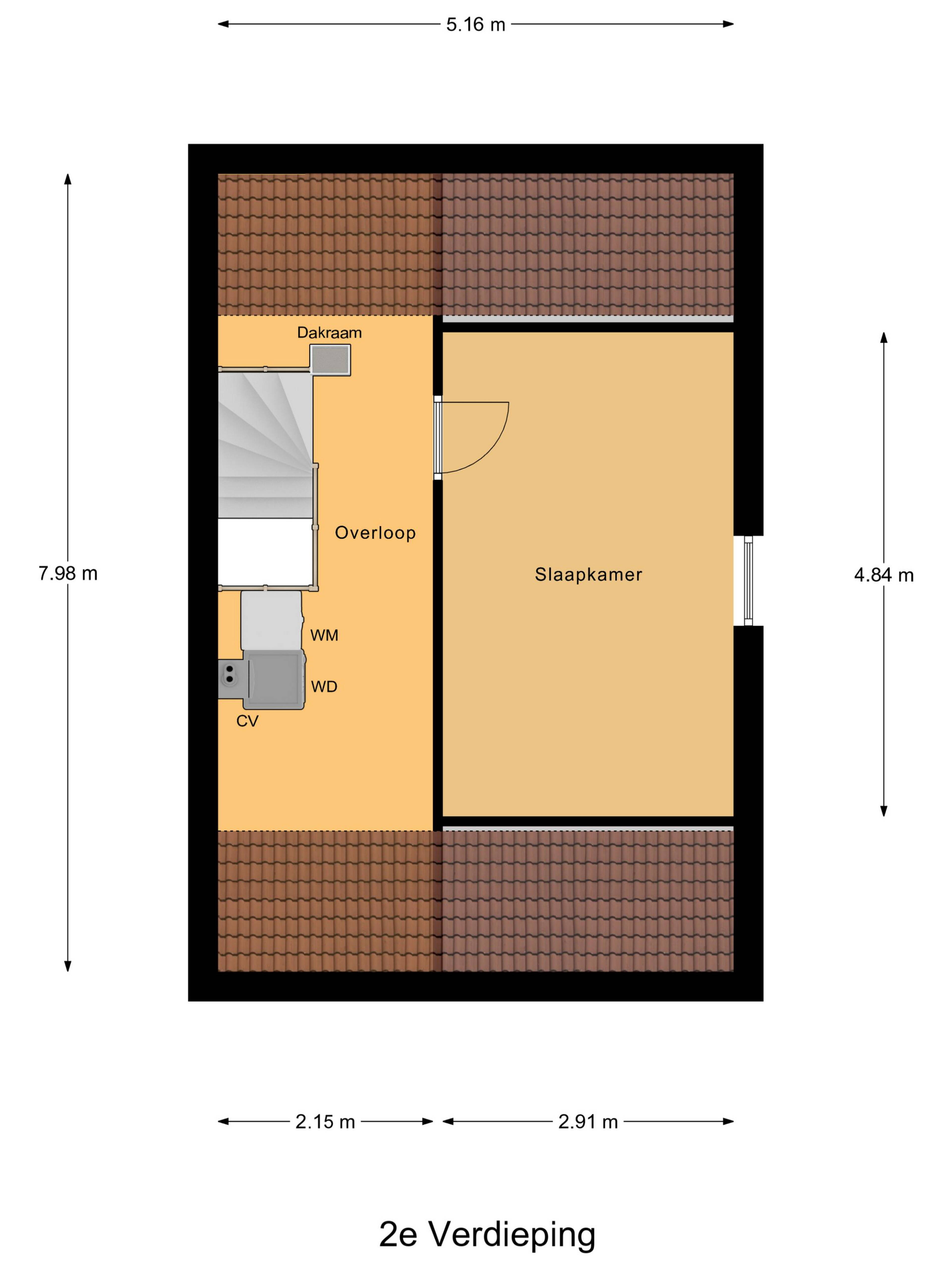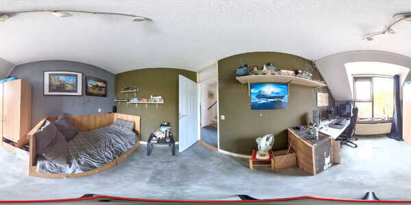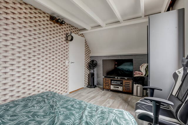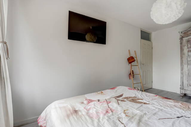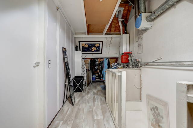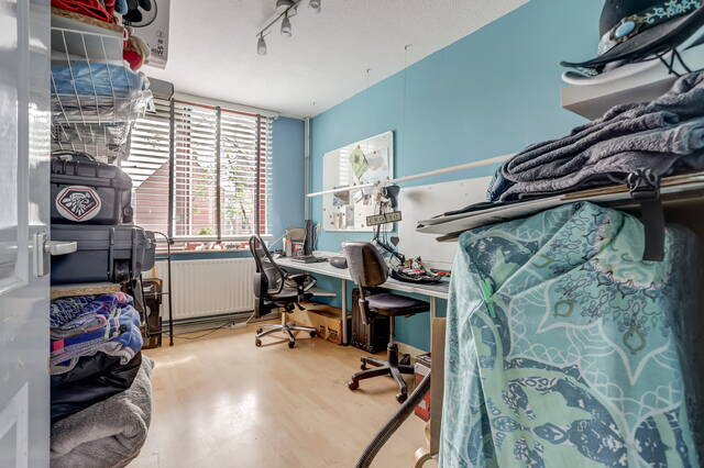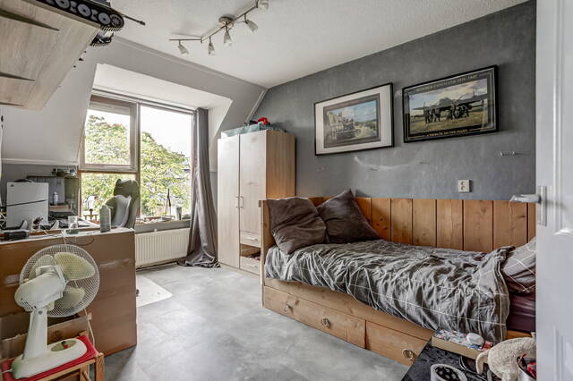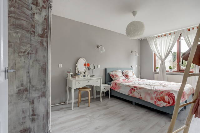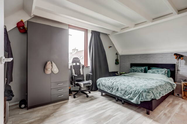 Op de tweede verdieping kom je via de overloop in de vierde slaapkamer, een ruime kamer met groot zijraam. Hier is ruimte genoeg voor een tweepersoonsbed, kast en bureau. Op de overloop bevinden zich de aansluitingen voor wasmachine en droger, de cv-ketel en voldoende plek om de was te drogen. Via de vlizotrap bereik je de vliering, ideaal voor extra bergruimte.