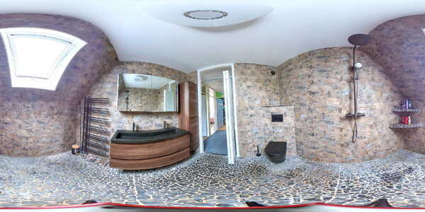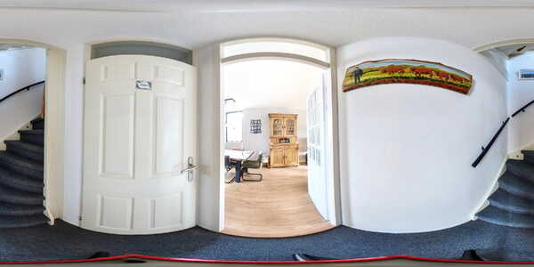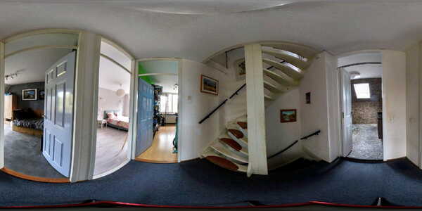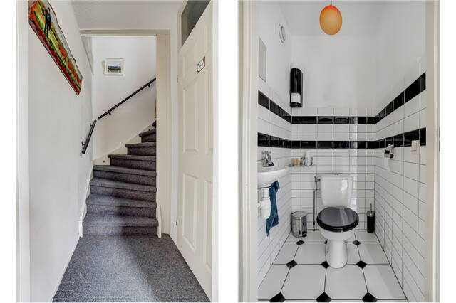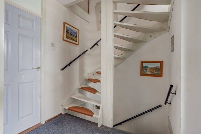 Terug in de woonkamer vind je halverwege een deur naar het toilet en de trap naar de eerste verdieping.