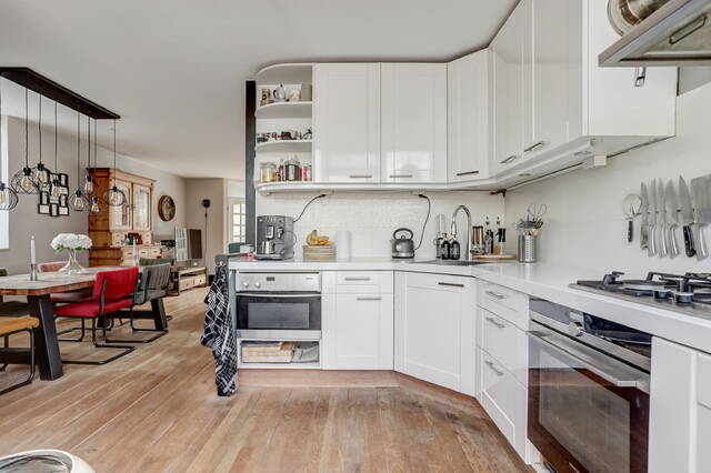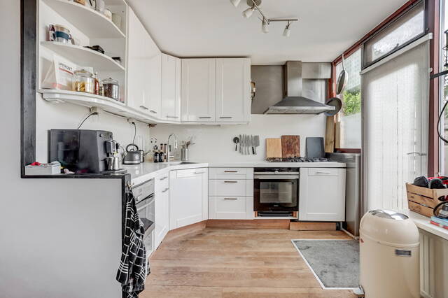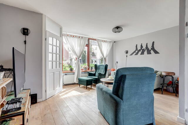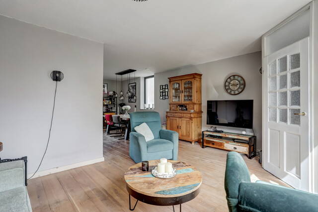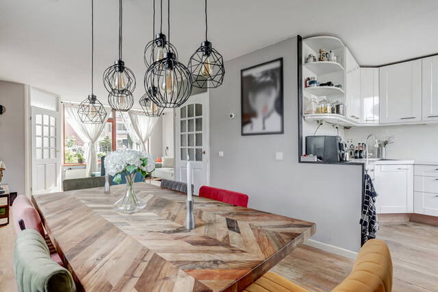 De woonkamer is licht en ruim dankzij het grote raam aan de voorzijde. Een fijne plek om een mooie zithoek te creëren. De woonkamer loopt over in de eetkamer: een royale ruimte waar je eenvoudig een tafel voor 6 tot 8 personen kwijt kunt. Door het extra zijraam is dit een heerlijke plek om te werken, de krant te lezen of samen een kop koffie te drinken.