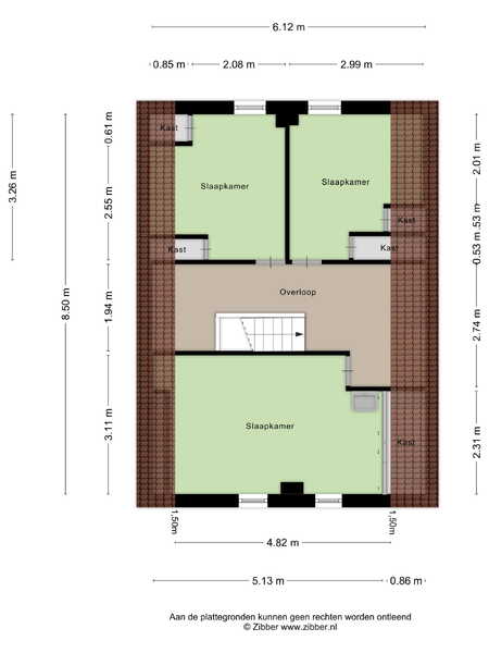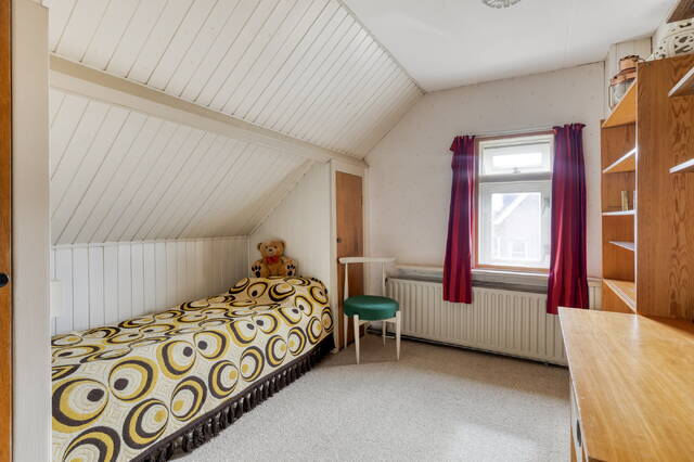 Slaapkamer 3 (ca. 7 m2) is gelegen aan de zijkant van de woning en beschikt over twee vaste kasten en bergruimte achter het knieschot.