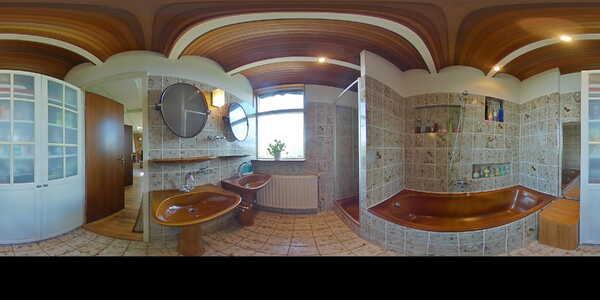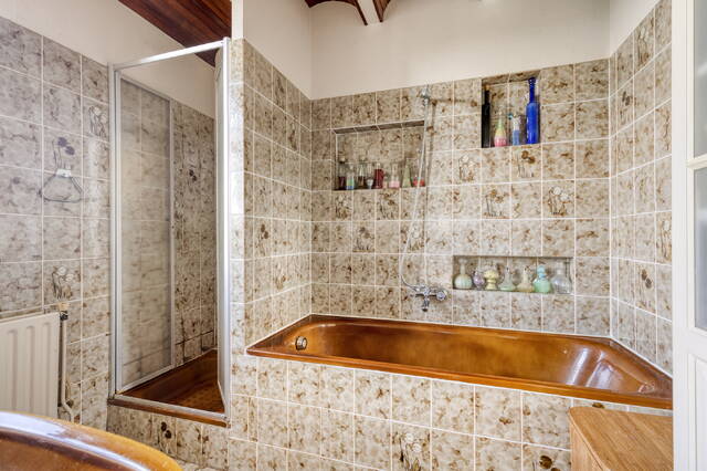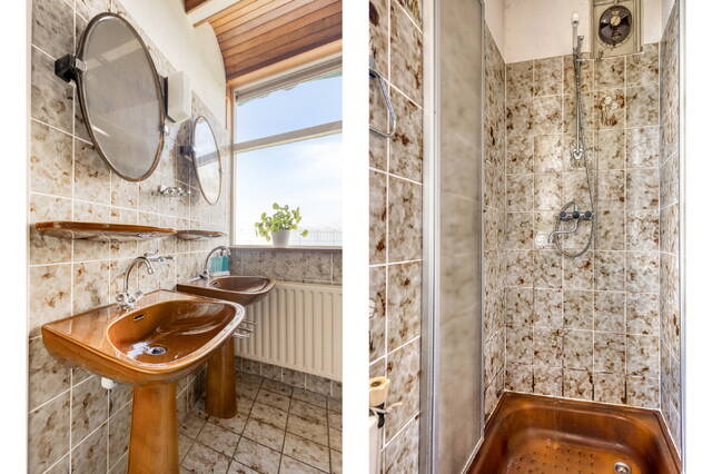 De badkamer (ca. 6 m2) bevindt zich op de begane grond en biedt alle basisvoorzieningen voor comfortabel gebruik. De ruimte is uitgerust met een ligbad, een dubbele wastafel en een douchecabine. De wanden en vloer zijn volledig betegeld, waardoor de badkamer direct functioneel is. Modernisering is gewenst.