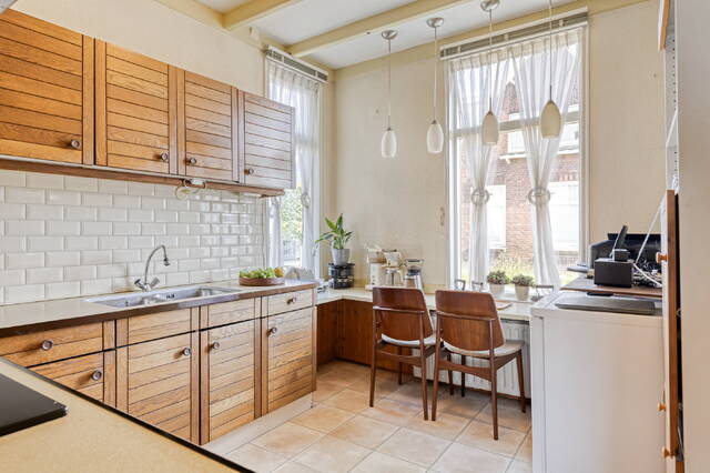 De ruime woonkamer in L-vorm (ca. 28 m2) biedt ruimte en sfeer. Authentieke plafondbalken en de houten open haard zorgen voor een warme uitstraling, terwijl de klassieke parketvloer de karakteristieke stijl van 1923 benadrukt. Dankzij de grote raampartijen is de kamer heerlijk licht. Het slimme L-formaat maakt het bovendien mogelijk om een gezellig eetgedeelte te creëren, ideaal voor lange avonden tafelen met familie en vrienden. Via de woonkamer is het souterrain bereikbaar.
