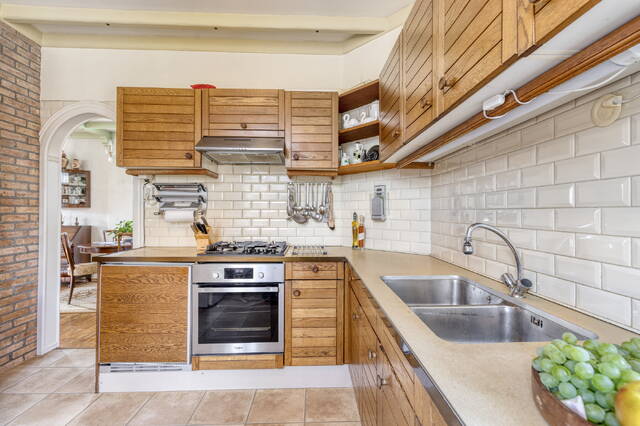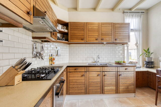 Aan de voorzijde van de woning bevindt zich de keuken (ca. 10 m2), uitgevoerd met een praktische L-vormige opstelling. Hoewel modernisering wenselijk is, is de keuken functioneel en compleet ingericht met onder andere een 4-pits gaskookplaat, oven, koelkast, afzuigsysteem, dubbele spoelbak en een close-in boiler. Dankzij de indeling is er voldoende werk- en bergruimte, en kunt u de keuken geheel naar eigen smaak en stijl vernieuwen.