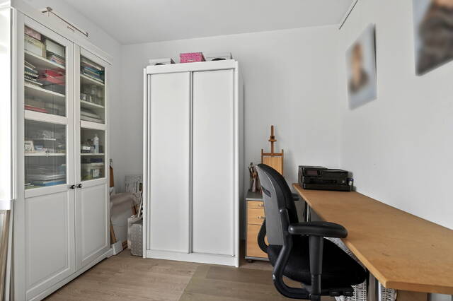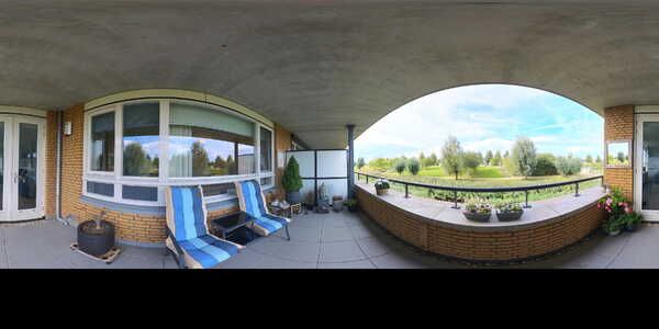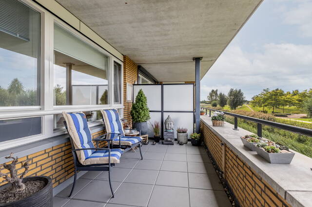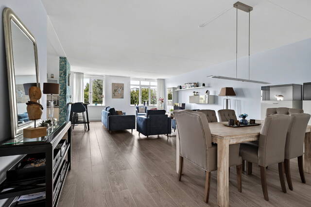 De woonkamer van circa vijftig vierkante meter is royaal van opzet en valt direct op door de grote ramen en de hoeveelheid licht die naar binnen stroomt. Dankzij de ligging op het westen geniet u hier in de middag en avond van prachtige lichtinval en een vrij uitzicht over het park. Via dubbele deuren heeft u toegang tot het ruime balkon van meer dan tien vierkante meter. Dit is een heerlijke plek om lange zomeravonden door te brengen met een drankje, of gewoon om te genieten van de rust en het uitzicht op het groen.